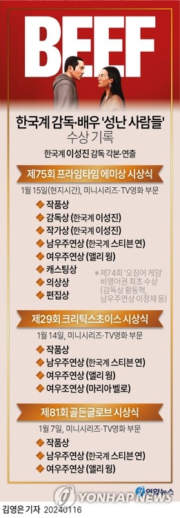 | ▲ [그래픽] 한국계 감독·배우 '성난 사람들' 수상 기록 (서울=연합뉴스) 김영은 기자 = 한국계 감독과 배우들이 활약한 넷플릭스 드라마 '성난 사람들'(원제 BEEF)이 골든글로브에 이어 북미 비평가들이 주관하는 크리틱스초이스 어워즈도 싹쓸이했다. 성난 사람들은 14일(현지시간) 로스앤젤레스(LA)에서 열린 제29회 크리틱스초이스상 시상식의 미니시리즈·TV영화 부문에서 작품상을 비롯해 남우주연상(스티븐 연), 여우주연상(앨리 웡), 여우조연상(마리아 벨로) 등 4관왕을 차지했다. 0eun@yna.co.kr 트위터 @yonhap_graphics 페이스북 tuney.kr/LeYN1 |