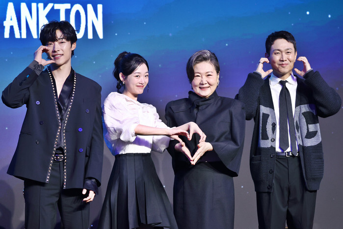 The stars fo the new Netflix original series "Mr. Plankton" -- Woo Do-hwan, Lee Yoo-mi, Kim Hae-sook and Oh Jung-sae (L to R) -- pose for a photo during a publicity event in Seoul on Nov. 4, 2024. The 10-episode series will be released worldwide on Nov. 8. (Yonhap)