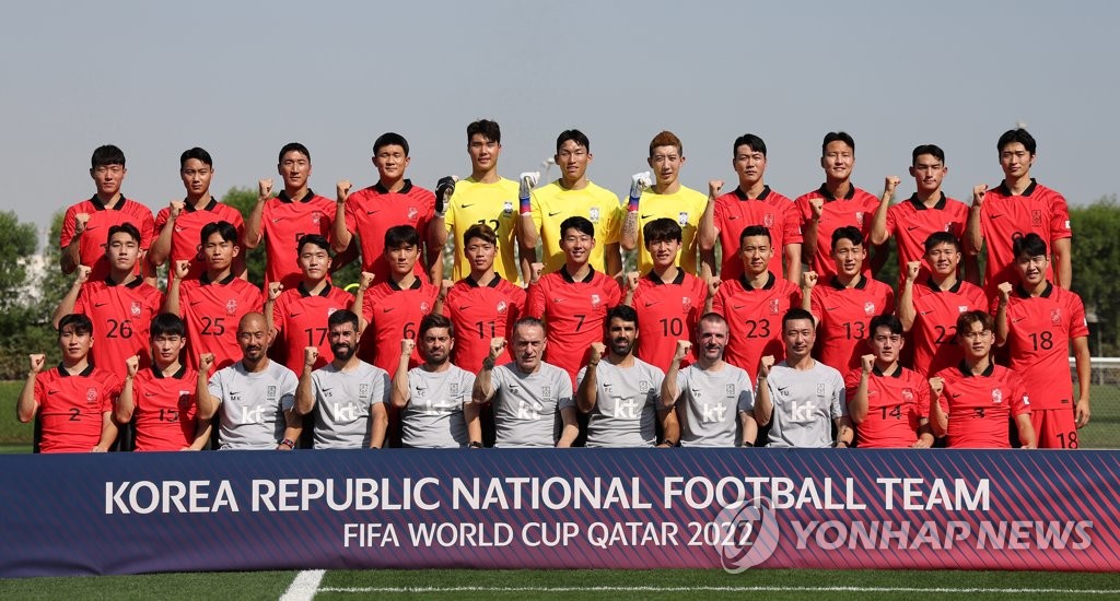 | ▲ 벤투호 완전체 기념촬영 (도하=연합뉴스) 임헌정 기자 = 2022 카타르 월드컵에 출전하는 대한민국 축구 국가대표팀 선수들이 16일 오전(현지시간) 카타르 도하의 알에글라 훈련장에서 기념촬영을 하고 있다. 대표팀은 이날 '캡틴' 손흥민의 합류로, 완전체가 됐다. 2022.11.16 kane@yna.co.kr |