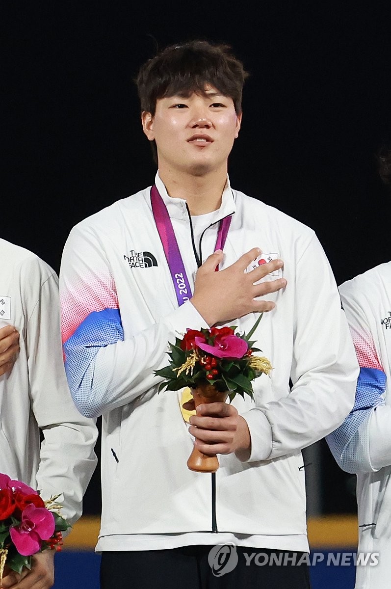 | ▲ 금메달 목에 건 장현석 지난 7일 중국 저장성 항저우 인근 사오싱 야구·소프트볼 스포츠센터 제1구장에서 열린 2022 항저우 아시안게임(AG) 결승, 대만과 대한민국의 경기에서 2-0으로 승리하며 금메달을 획득한 대한민국 투수 장현석이 시상식에서 메달을 목에 건 채 국기에 대한 경례를 하고 있다. [연합뉴스 자료사진] |