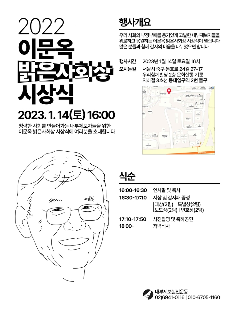 (서울=연합뉴스) 전성훈 기자 = 시민단체 내부제보실천운동은 '제5회 이문옥 밝은사회상' 보도부문 수상자로 연합뉴스 양정우 기자와 KBS 이호준 기자 등 2명을 선정했다고 13일 밝혔다.