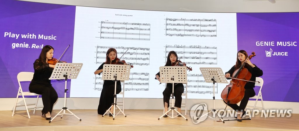 | ▲ AI가 만든 악보로 듣는 'I believe' 현악 4중주 (서울=연합뉴스) 이재희 기자 = 28일 오전 서울 강남구 지니뮤직에서 열린 AI(인공지능) 기술로 구현한 악보 기반 편곡 서비스 '지니리라'(genie.Re:La) 베타버전 론칭 행사에서 연주자들이 AI가 가요 '아이 빌리브'(I believe)를 바하 스타일로 편곡한 악보로 연주하고 있다. 지니뮤직과 AI 스타트업 주스가 함께 만든 지니리라는 좋아하는 음악을 AI가 디지털 악보로 구현해주고, 이용자가 편곡까지 가능한 서비스다. 2023.6.28 scape@yna.co.kr |