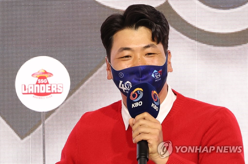 | ▲  Kim Kwang-hyun of the SSG Landers speaks during the Korea Baseball Organization media day at Grand Hyatt Seoul in Seoul on March 31, 2022. (Yonhap) |