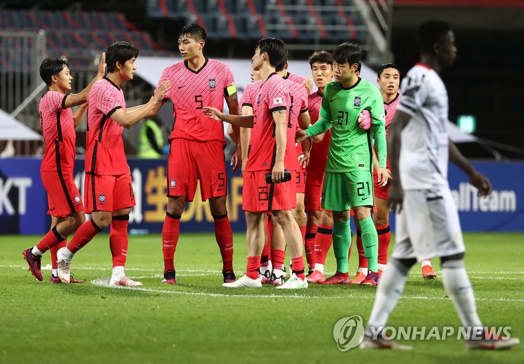 | ▲ In this file photo from June 15, 2021, members of the South Korean men's Olympic football team celebrate their 2-1 victory over Ghana in a friendly match at Jeju World Cup Stadium in Seogwipo, Jeju Island. (Yonhap) |