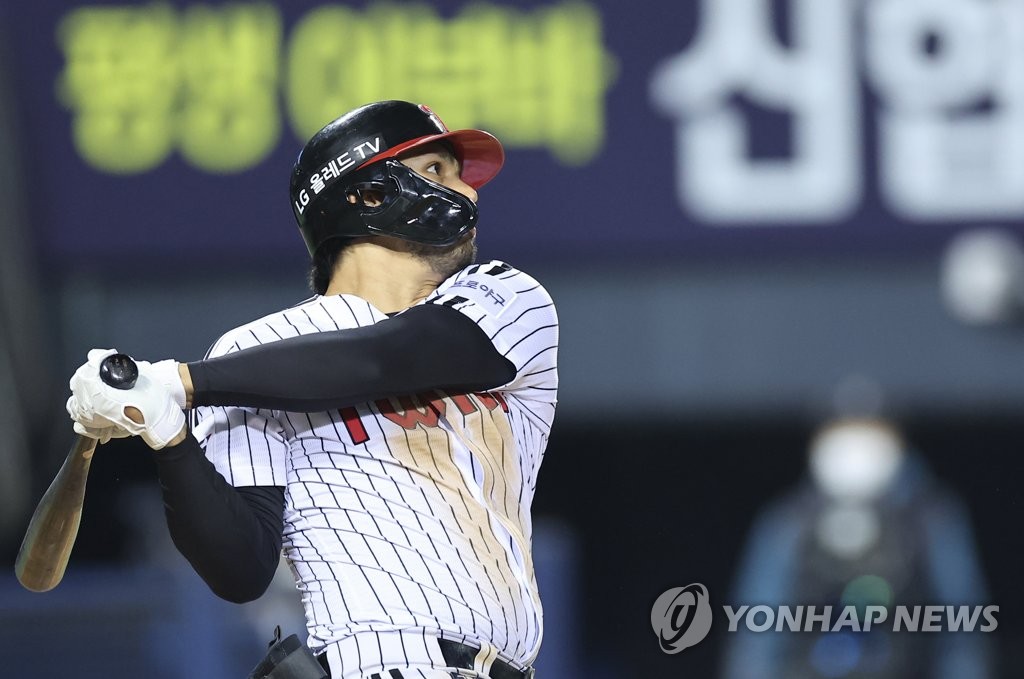 | ▲ In this file photo from April 8, 2022, Rio Ruiz of the LG Twins hits a triple against the NC Dinos during the bottom of the eighth inning of a Korea Baseball Organization regular season game at Jamsil Baseball Stadium in Seoul. (Yonhap) |