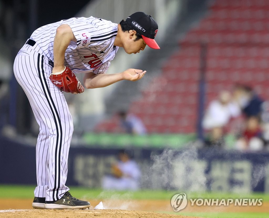 | ▲ In this file photo from May 24, 2022, LG Twins reliever Jin Hae-soo blows his hand after grabbing a rosin bag during the top of the ninth inning of a Korea Baseball Organization regular season game against the Kiwoom Heroes at Jamsil Baseball Stadium in Seoul. (Yonhap) |