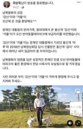 곽상욱 오산시장은 이날 페이스북 라이브 방송을 통해 "문재인 대통령의 반려가족, 청와대에서 온 풍산개 '강산'이와 '겨울'이가 반려동물 테마파크에 보금자리를 마련했다"고 밝혔다.
