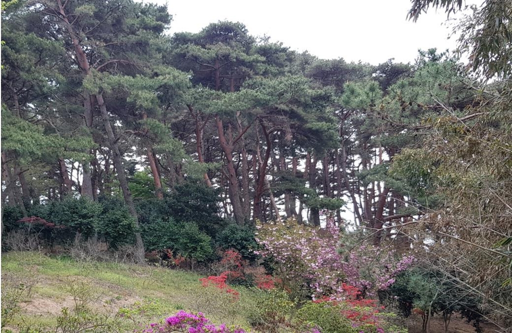 삼산 송정 소나무 숲은 붉은 갈색의 소나무 적송 군락지로 보존가치가 높은 아름다운 숲을 이루고 있다.
