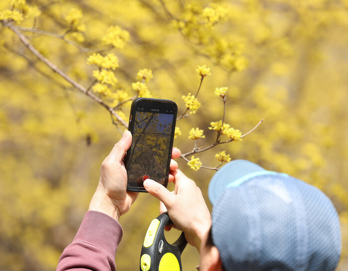 A man takes a photo of flowers with his smartphone at the entrance of the Han River Park in Seoul on March 17, 2024. (Yonhap)