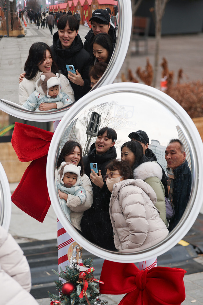 A family is seen taking photos of themselves reflected in a mirror installed at Gwanghwamun Square in central Seoul, on Dec. 28, 2025, the last weekend before the start of the new year. (Yonhap)