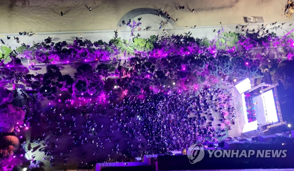 | ▲ BTS 부산 공연 전야 이벤트 (부산=연합뉴스) 조정호 기자 = 2030 부산세계박람회 유치를 기원하는 방탄소년단(BTS)의 단독 콘서트 '옛 투 컴 인 부산'(Yet To Come in Busan)을 하루 앞둔 14일 파라다이스 호텔 부산이 신관 야외 가든에서 마련한 '전야 이벤트'에서 '아미'(방탄소년단 팬)와 시민들이 보랏빛으로 물든 야경을 배경으로 공연을 즐기고 있다. 2022.10.14 ccho@yna.co.kr |