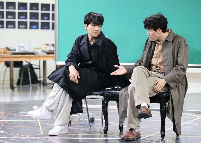 South Korean actors Son Ho-jun (L) and Jung Kyung-hoon, who star in the new play "Angels in America," perform during a publicity event in Seoul on July 24, 2024. The musical will run from Aug. 6 to Sept. 28. (Yonhap)