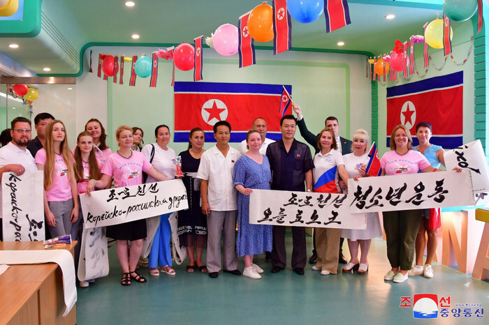 This photo, provided by North Korea's official Korean Central News Agency, shows a Russian delegation posing during a friendship evening event for North Korean and Russian child campers at the Songdowon International Children's Camp in Wonsan, Kangwon Province, on July 30, 2024. (For Use Only in the Republic of Korea. No Redistribution) (Yonhap)