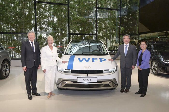 Hyundai Motor President Chang Jae-hoon (2nd from R) and Cindy McCain (2nd from L), executive director of the World Food Programme (WFP), pose beside the carmaker's all-electric Ioniq 5 carrying the WFP's logo after signing a mobility partnership in Seoul on July 31, 2024, in this photo provided by Hyundai. (PHOTO NOT FOR SALE) (Yonhap)