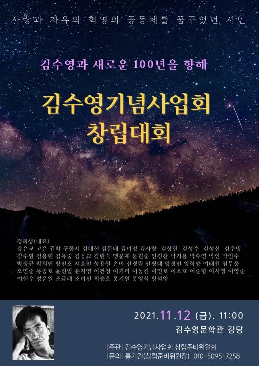 김수영기념사업회는 이날 오전 11시 서울 도봉구 김수영문학관에서 고은, 신경림 시인과 소설가 황석영 등 발기인 57명이 창립총회를 연다고 2일 밝혔다.