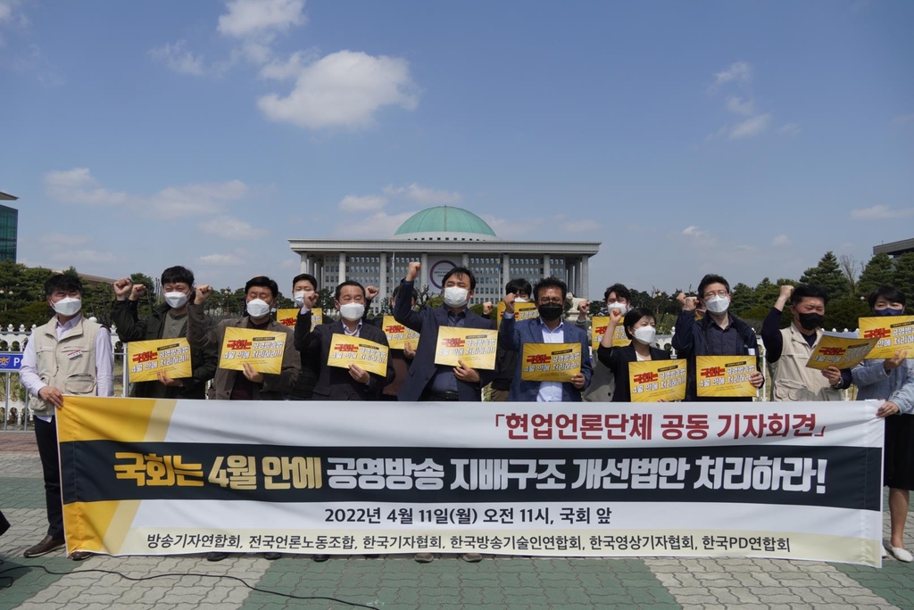 방송기자연합회와 전국언론노동조합, 한국기자협회, 한국방송기술인연합회, 한국영상기자협회, 한국PD연합회 등 6개 단체는 11일 서울 여의도 국회 앞에서 기자회견을 열어 "공영방송 지배구조 개선법안을 4월 안에 처리하라"고 요구했다.