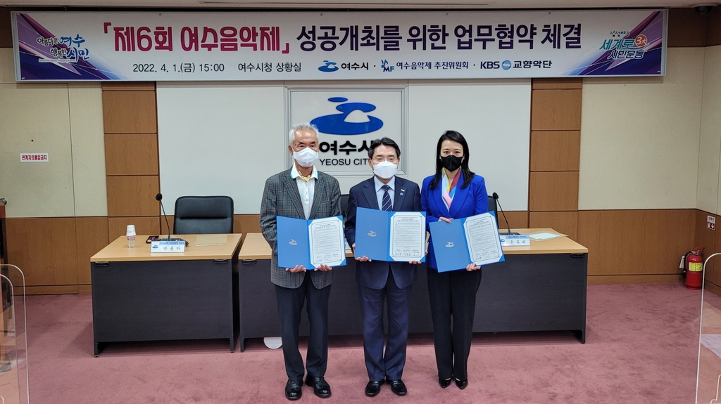 ▲ KBS교향악단은 여수시, 여수음악제 추진위원회와 '제6회 여수음악제' 성공 개최를 위한 업무협약을 1일 여수시청에서 체결했다고 밝혔다. 이번 여수음악제는 오는 9월 2∼7일 여수시 GS칼텍스 예울마루 등에서 개최된다. 앞서 음악제 프로그램의 하나로 학생들에게 수준 높은 교육을 제공하는 음악학교가 5∼8월 진행된다. (서울=연합뉴스)