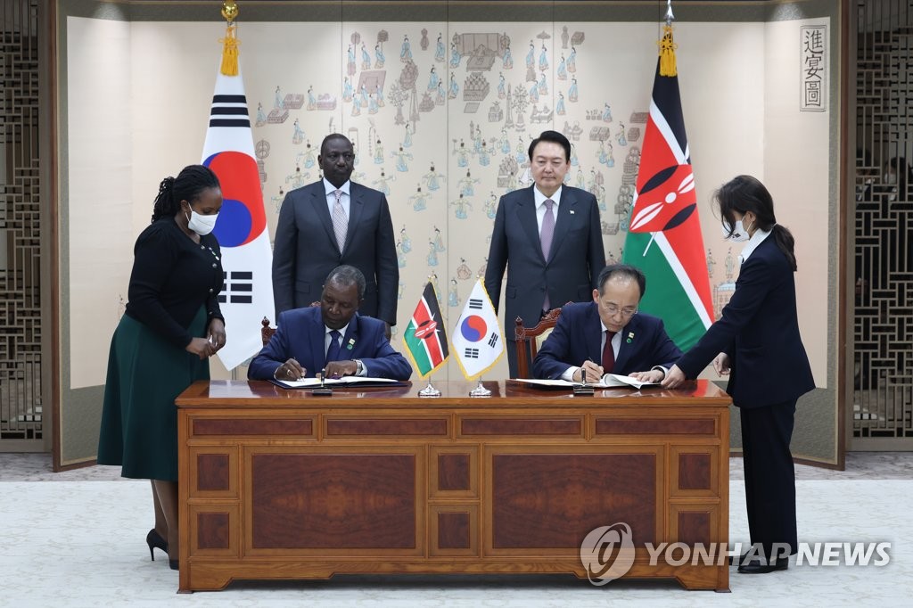 | ▲ This photo, provided by the presidential office, shows South Korean President Yoon Suk-yeol (R, back row) and Kenyan President William Ruto (L, back row) watching their ministers sign an agreement to raise the ceiling of Seoul's development cooperation loans to the East African country, at the presidential office in Yongsan, Seoul, on Nov. 23, 2022. (PHOTO NOT FOR SALE) (Yonhap) |