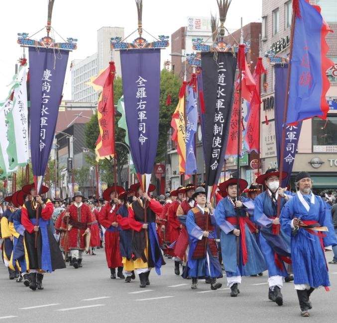 이날 온양온천역 광장에서는 전문가들의 고증으로 재현한 100여명의 기마대와 기수단으로 구성된 삼도수군통제사의 출정행렬과 군악의장 거리퍼레이드가 펼쳐지며 오는 30일까지 이어지는 축제의 시작을 알렸다.