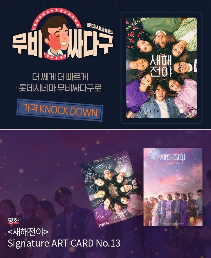 롯데시네마는 또 '새해전야' 주연 배우들의 사인이 담긴 포스터 '시그니처 아트카드'를 출시하고, '새해전야' 좌석을 예매한 관객에게 10일부터 선착순으로 나눠줄 예정이다.