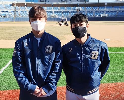 | ▲ Kim Hyung-jun (L) and Kim Seong-uk of the NC Dinos pose for photos during their club's spring training at Masan Baseball Stadium in Changwon, 400 kilometers southeast of Seoul, on Feb. 3, 2021. (Yonhap) |