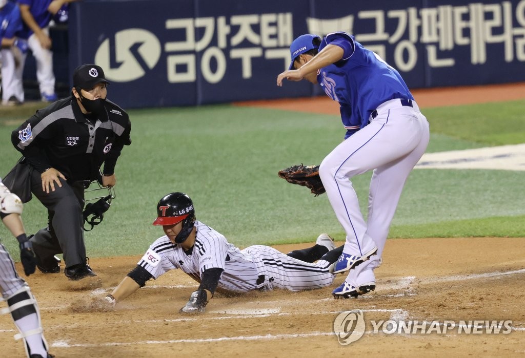 | ▲ In this file photo from Sept. 24, 2021, Gu Bon-hyeok of the LG Twins (L) scores against the Samsung Lions during the bottom of the seventh inning of a Korea Baseball Organization regular season game at Jamsil Baseball Stadium in Seoul. (Yonhap) |