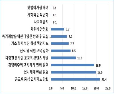 사교육비 감소를 위해서는 공교육 중심 입시제도를 강화해야 한다는 응답이 21.4%로 가장 많았다. 다양한 온라인 공교육 콘텐츠를 개발해야 한다는 응답은 10.8%였다.
