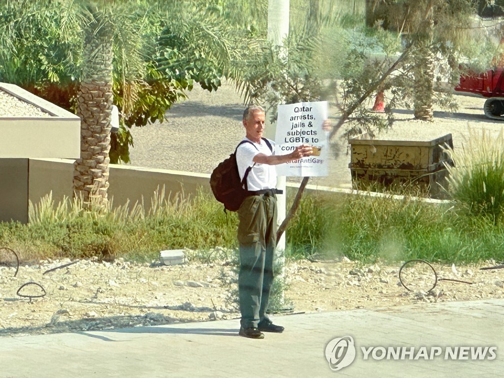 | ▲ 카타르서 1인 시위를 벌인 영국 인권운동가 피터 태첼 [로이터=연합뉴스] |