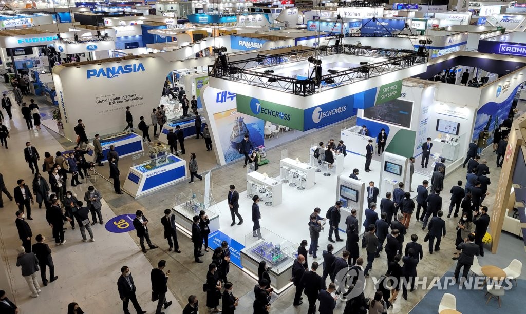 ▲ 부산국제조선해양대제전 개막 (부산=연합뉴스) 조정호 기자 = 19일 부산 해운대구 벡스코에서 열린 '2021 부산국제조선해양대제전(코마린)'에서 관람객들이 조선과 해양플랜트 산업 최신 기술을 살펴보고 있다. 올해는 30개국, 700여 개 업체가 1천500개 부스 규모로 참가했다. 2021.10.19 ccho@yna.co.kr