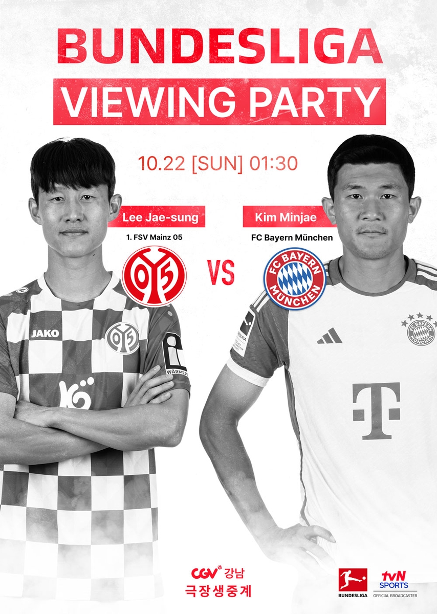 ▲ 이재성·김민재 분데스리가 코리안 더비 CGV에서 중계 = tvN스포츠와 CGV가 축구선수 이재성이 소속된 마인츠 구단과 김민재가 소속된 바이에른 뮌헨 구단의 경기를 오는 22일 오전 1시 30분 CGV강남 1관에서 생중계한다.