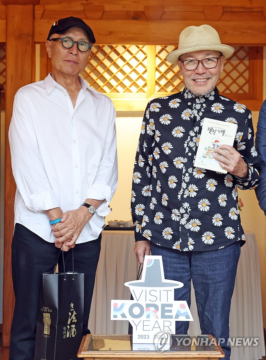 | ▲ South Korean comic book artist Huh Young-man (L), famous for "Sikgaek," or gourmet, poses for a photo with Japanese manga writer Masayuki Kusumi, known for "The Solitary Gourmet," during their meeting at a traditional Korean hanok house in central Seoul on Sept. 13, 2023, in this photo provided by the culture ministry. (PHOTO NOT FOR SALE) (Yonhap) |