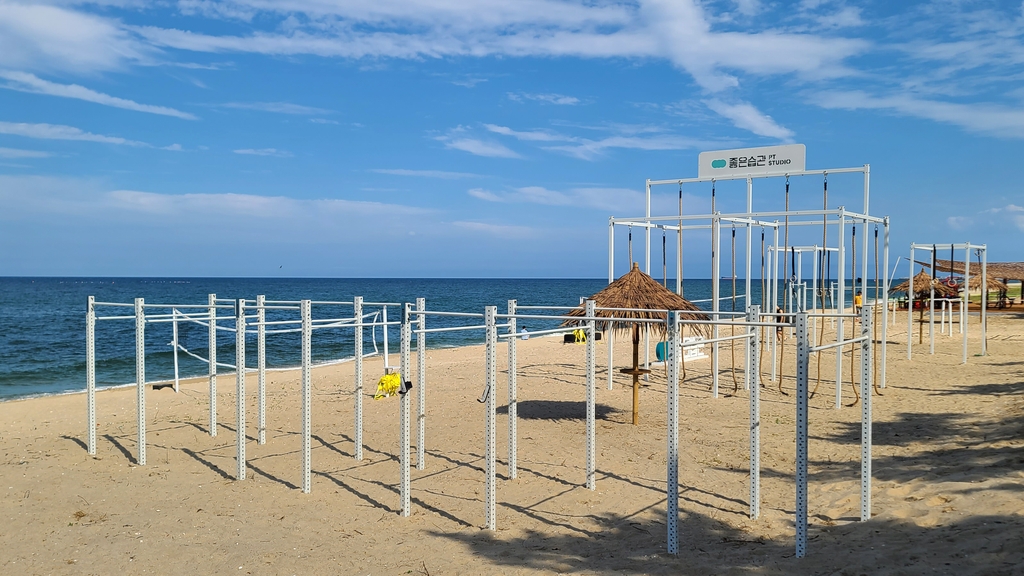 (강릉=연합뉴스) 유형재 기자 = 강원 강릉시 강문해변에 운동기구를 갖춘 머슬비치가 조성됐다.