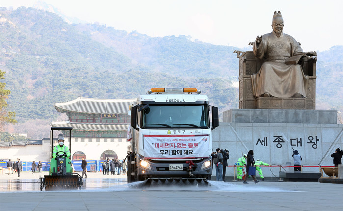 Work to clear fine dust is in progress at Gwanghwamun Square in downtown Seoul on March 20, 2024. (Yonhap)