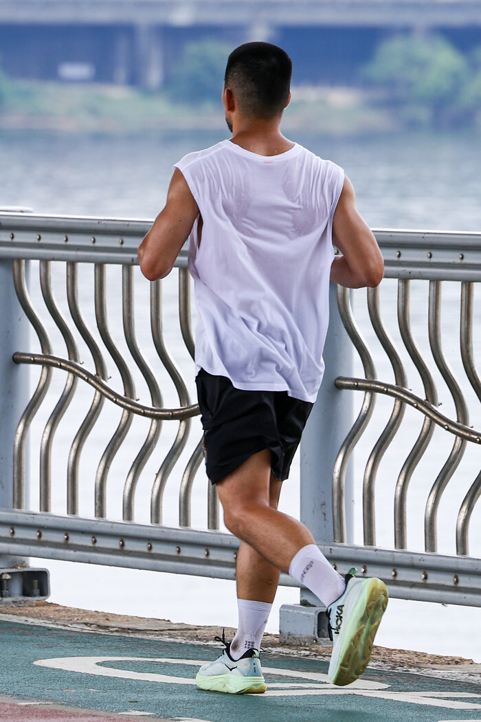 A man with his shirt soaked in sweat runs on Jamsu Bridge over the Han River in Seoul on Aug. 1, 2025, amid temperatures rising to an intraday high of 35 C in the capital, as the Korean concept of "fight heat with heat" suggests that consuming hot foods or exercising can help regulate body temperature and make you feel cooler in hot weather. (Yonhap)