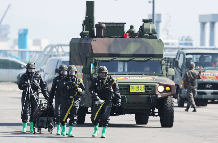 South Korean soldiers take part in chemical, biological and radiological (CBR) warfare training at an international ferry terminal in Pyeongtaek, south of Seoul, on March 11, 2025, under a scenario where an unidentified projectile has fallen. The drill, led by the Navy's 2nd Fleet Command, is part of the annual military drills, the Freedom Shield, that Seoul and Washington launched the previous day, to enhance their combined defense capabilities against North Korean military threats. (Yonhap)