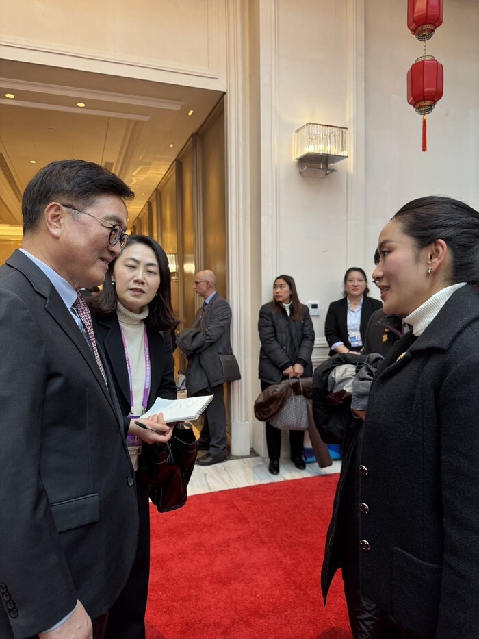 South Korean National Assembly Speaker Woo Won-shik (L) talks with Thai Prime Minister Paetongtarn Shinawatra during a luncheon hosted by Chinese President Xi Jinping at Taiyangdao Hotel in Harbin, northeastern China, on Feb. 7, 2025, ahead of the opening of the Feb. 7-14 Asian Winter Games, in this photo provided by the speaker's office. (PHOTO NOT FOR SALE) (Yonhap)