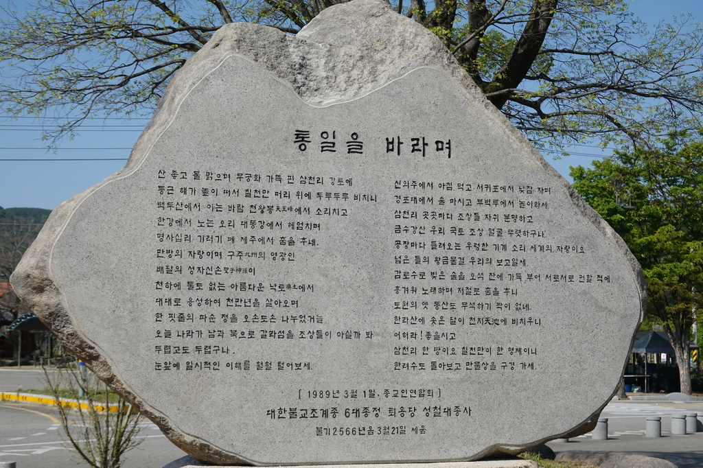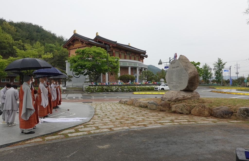 ▲ 성철스님 문도회와 경남 산청 겁외사(회주 원택스님)는 이 사찰 앞 광장에 성철스님의 법어 '통일을 바라며'를 새긴 통일기원비를 세웠다고 22일 밝혔다. 겁외사는 성철스님 고향인 산청에 그의 뜻을 기리고자 세운 절이다. (서울=연합뉴스)