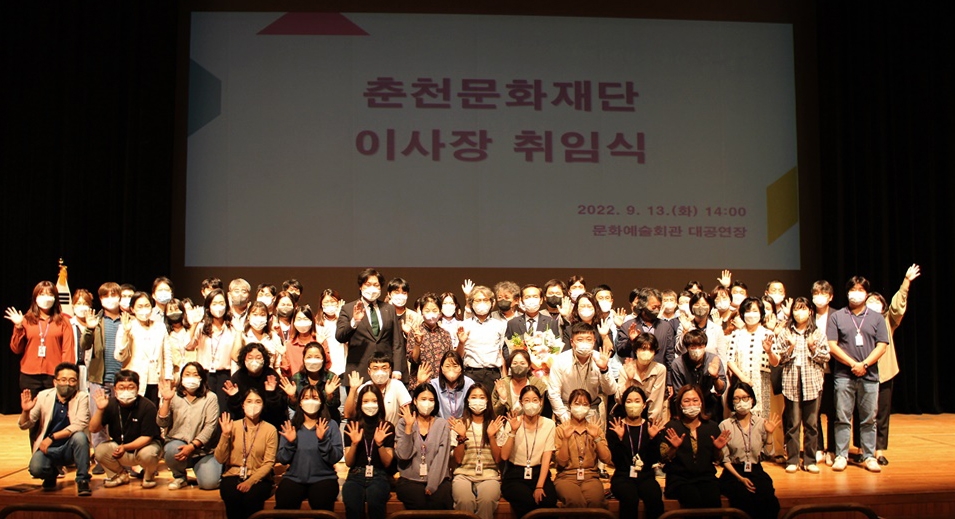 | ▲ 최연호 이사장과 직원들 취임식 기념촬영 [춘천문화재단 제공.재판매 및 DB 금지] |