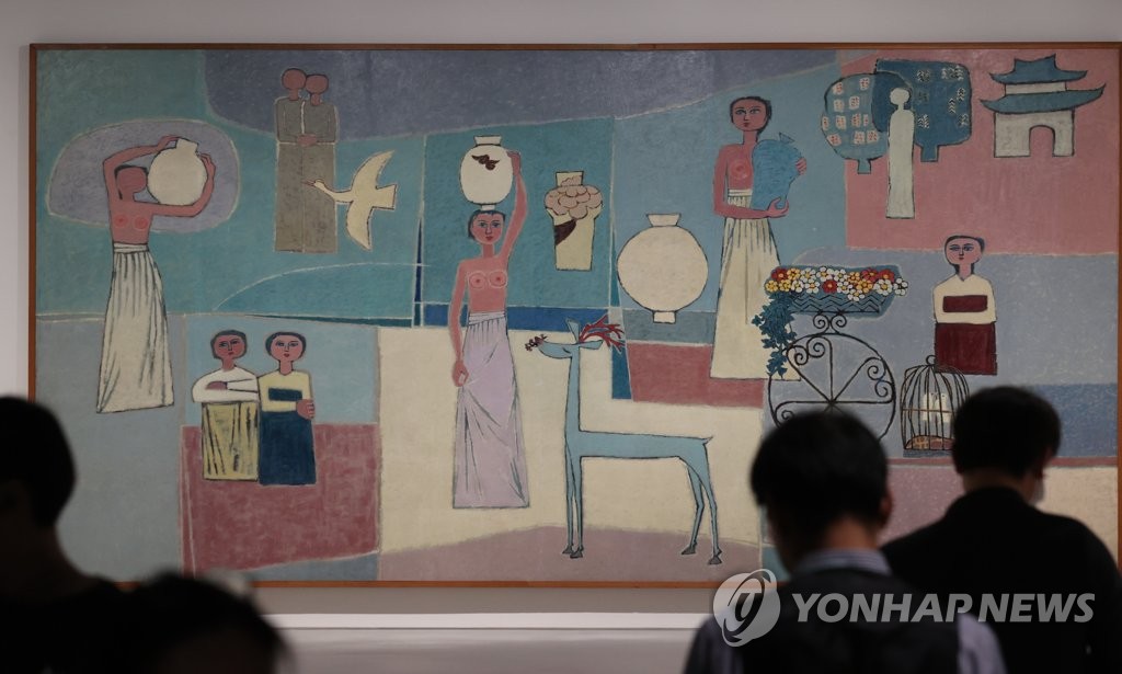 | ▲ 김환기 화백의 '여인들과 항아리' (용인=연합뉴스) 이재희 기자 = 15일 오전 경기 용인시 호암미술관에서 열린 김환기 회고전 '한 점 하늘 김환기' 기자간담회에서 참석자들이 전시를 둘러보고 있다. 이 전시는 오는 18일부터 9월 10일까지 열린다. ⓒ환기재단·환기미술관. 2023.5.15