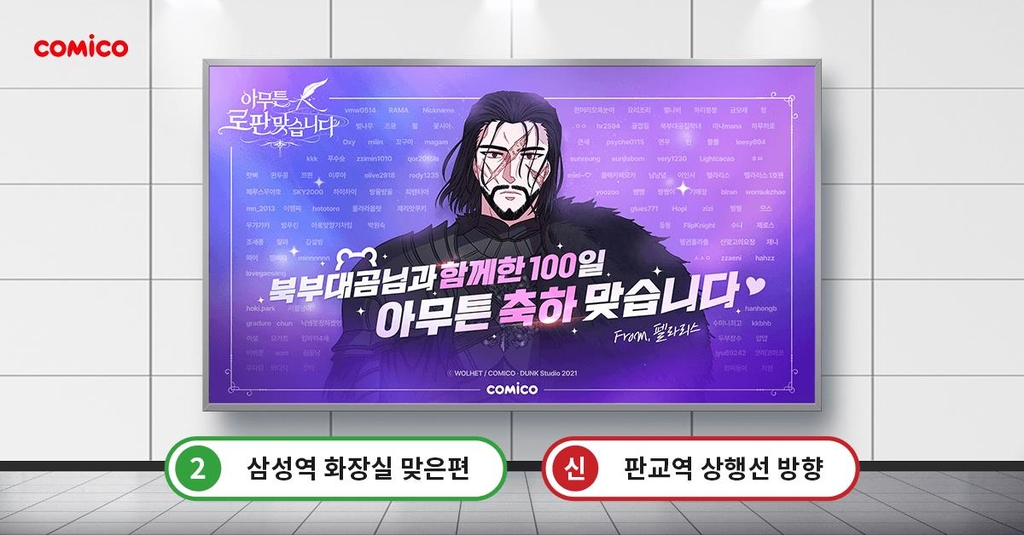 25일 웹툰 업계에 따르면 네이버시리즈는 이달 초 대표 노블코믹스(웹툰화한 웹소설) '화산귀환' 속 주인공 청명의 생일(10월 10일)을 축하하기 위해 5호선 청구역과 4호선 명동역, 신분당선 판교역 세 군데에 대형 생일 광고를 내걸었다.