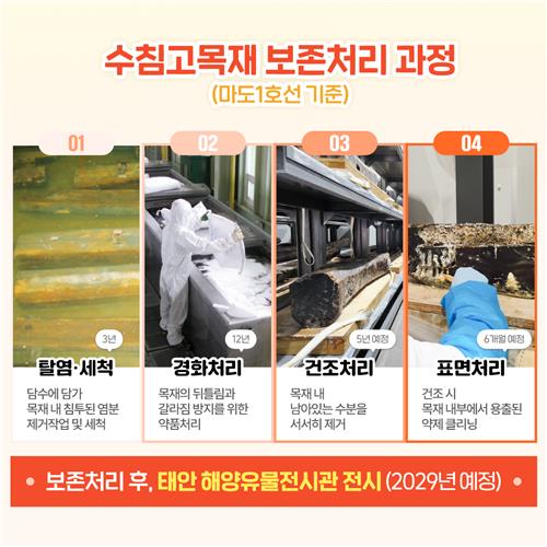 연구소는 앞서 태안선과 마도 1호선을 물 밖으로 꺼낸 이후 염분을 제거하고, 목재 강도를 보강하는 등 약 15년간 보존 처리 작업을 해왔다.