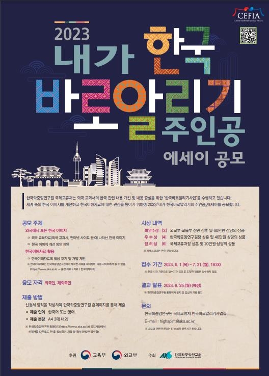 (서울=연합뉴스) 강성철 기자 = 한국학중앙연구원은 세계 속의 한국 이미지를 개선하기 위해 '2023 내가 한국 바로 알리기의 주인공'이라는 명칭으로 에세이를 공모한다고 31일 밝혔다.