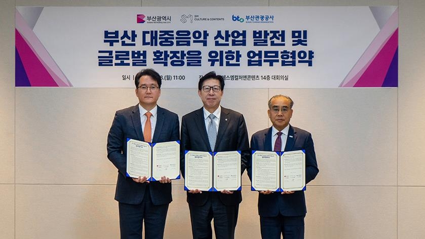 (부산·서울=연합뉴스) 조정호 김아람 기자 = 에스엠컬쳐앤콘텐츠(SM C&C)는 18일 부산시, 부산관광공사와 18일 서울 성동구 성수사옥에서 부산 대중음악 산업 발전과 글로벌 확장을 위한 업무협약을 체결했다.