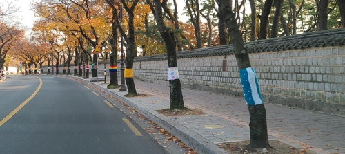 (경주=연합뉴스) 손대성 기자 = 경북 경주 유적지 중 한 곳인 대릉원 돌담길 가로수가 알록달록하게 변신해 눈길을 끈다.