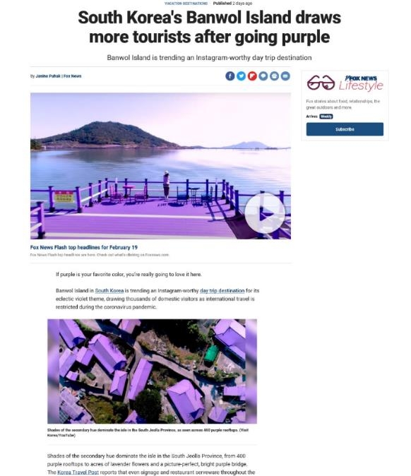 폭스뉴스는 '한국의 반월도는 퍼플섬으로 만든 후 더 많은 관광객을 끌어모으고 있다'는 제하의 기사를 핫토픽란에 올렸다.