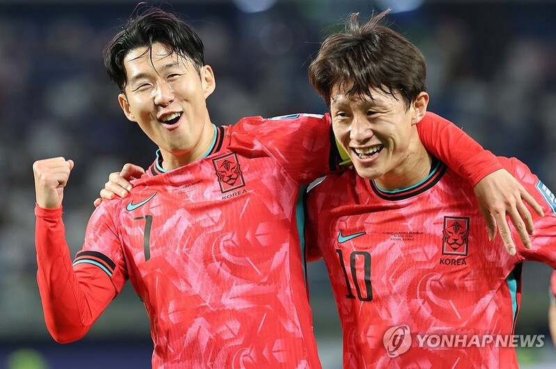 | ▲ 기뻐하는 손흥민과 이재성 (쿠웨이트시티=연합뉴스) 황광모 기자 = 14일 오후(현지시간) 쿠웨이트 자베르 알 아흐메드 국제 경기장에서 열린 2026 북중미 월드컵 아시아지역 3차 예선 B조 5차전 한국과 쿠웨이트의 경기. 한국 손흥민이 페널티킥을 넣고 이재성과 기뻐하고 있다. 2024.11.14 hkmpooh@yna.co.kr |