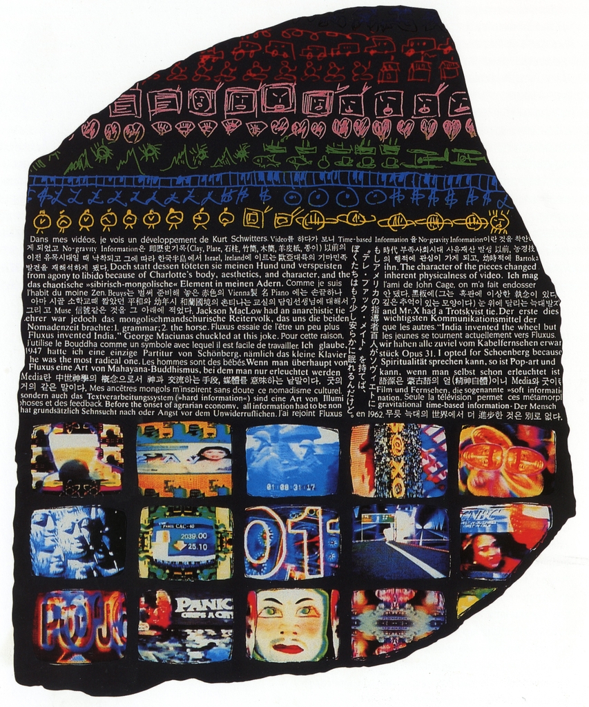비디오 영상 화면 이미지가 나열되고 한국어, 영어, 프랑스어 등으로 백남준의 예술 이력이 서술된 작품은 인터넷을 통해 데이터 간의 소통이 이뤄지는 오늘날을 원초적인 석판의 모습으로 보여준다.