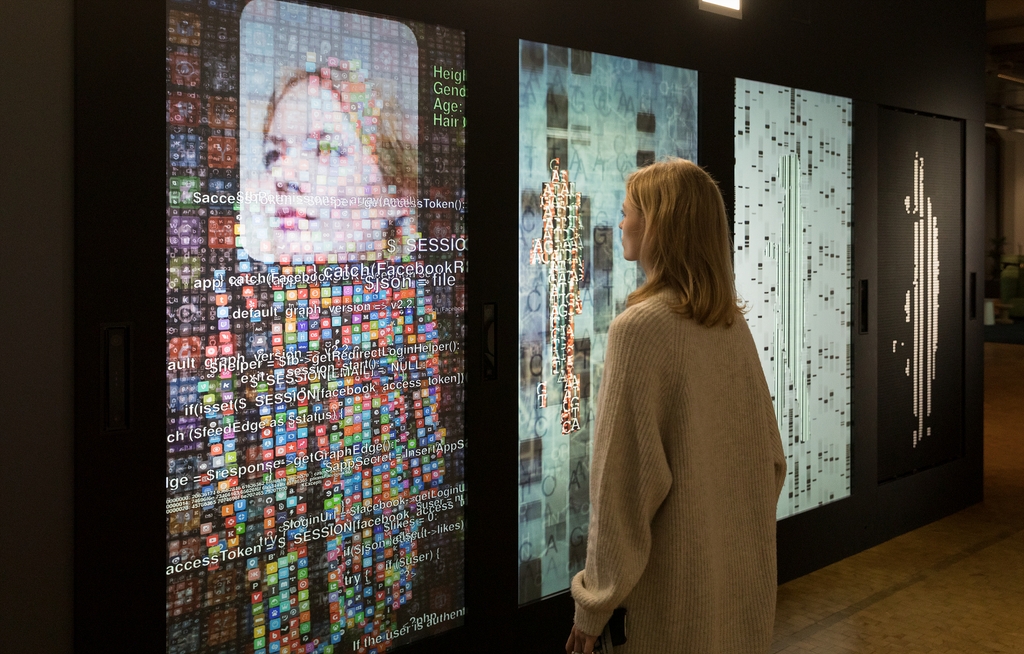독일 베른트 린터만·페터 바이벨 작가의 2017년 다채널 프로젝션 인터랙티브 설치 작품 '당신의 코드'(유어 코드·YOU:R:CODE)는 거울 앞에 선 관람객을 디지털 이미지로 변환한다.