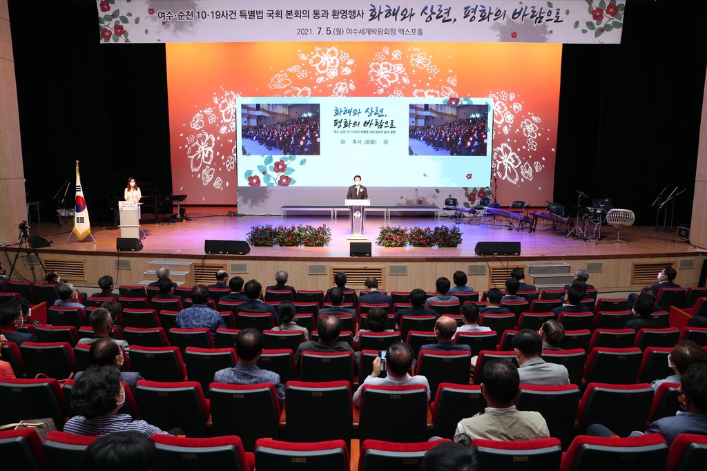 (여수=연합뉴스) 형민우 기자 = 여순사건 특별법 제정을 환영하는 행사가 5일 전남 여수시 여수세계박람회장에서 열렸다.