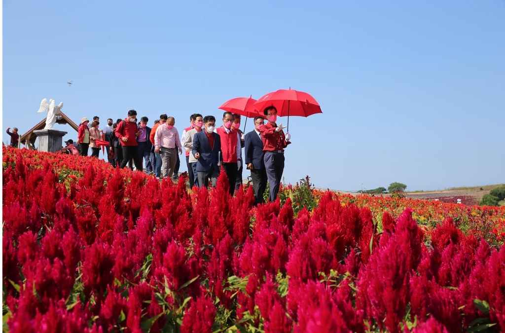 11ha에 달하는 대규모 맨드라미 꽃동산에서 하늘과 바다를 동시에 감상할 수 있다.